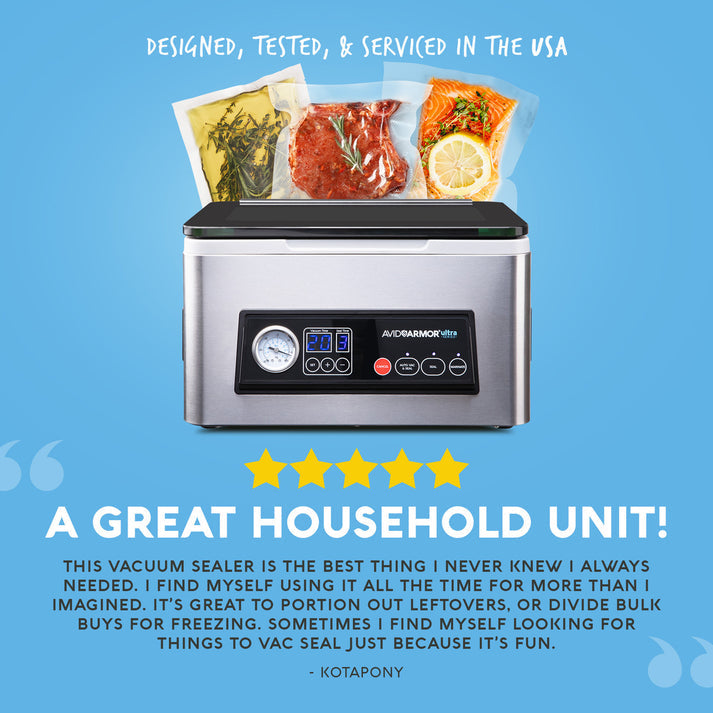 The Avid Armor Ultra Series USV20 is a powerful and compact chamber vacuum sealer built for home use, small-scale meal prep, and sous vide cooking. Featuring a sleek stainless steel design and customizable vacuum and seal settings, the USV20 gives you commercial-grade sealing power with simple, user-friendly operation.
