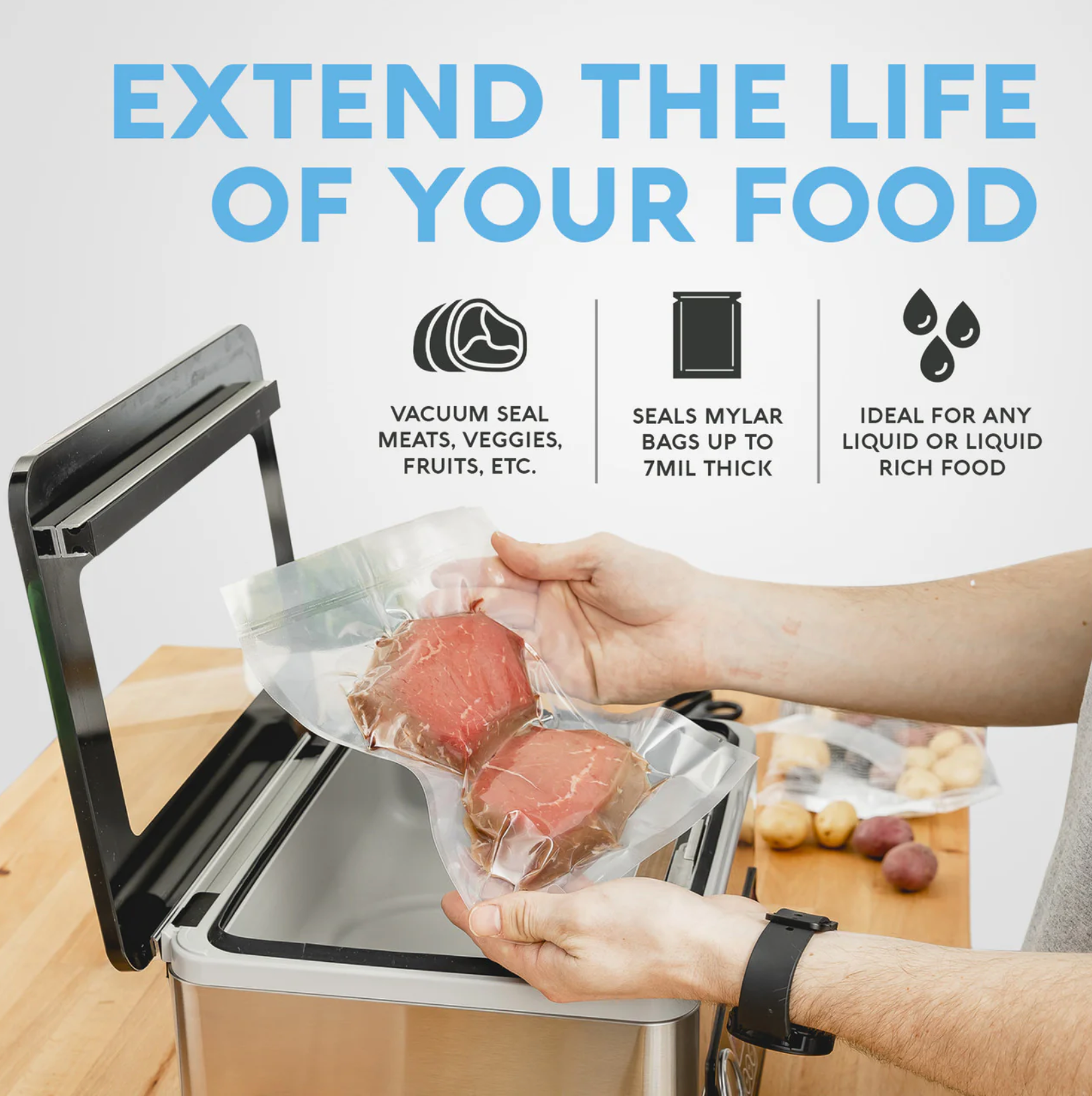 The USV20 is ideal for home chefs, food preservers, and sous vide enthusiasts who want professional-quality vacuum sealing in a compact, easy-to-use system. Whether you're storing fresh produce, prepping bulk meats, or sealing liquids, the USV20 offers performance and control you can count on.